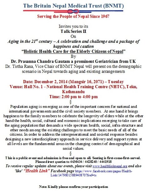The Second Health Forum discussion will be held on December 2, 2014, to promote debate on Aging in the 21st century – A celebration and challenge and a package of happiness and caution. Dr. Prasanna Chandra Gautam a prominent geriatrician from UK is going to take a lecture on the event.